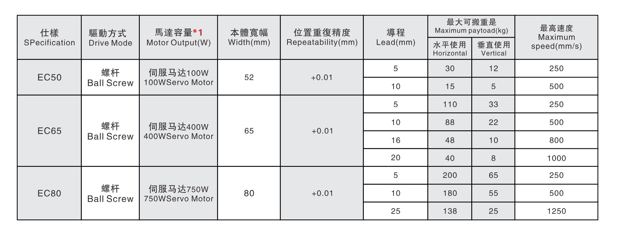 Use Where | Driven Mode | Model Specification | Moter Output(w) | Width(mm) | Repeatability(mm) | Ball Screw Spec | Maximum Payload(kg) | Maximum speed (mm/s)*1 | ||