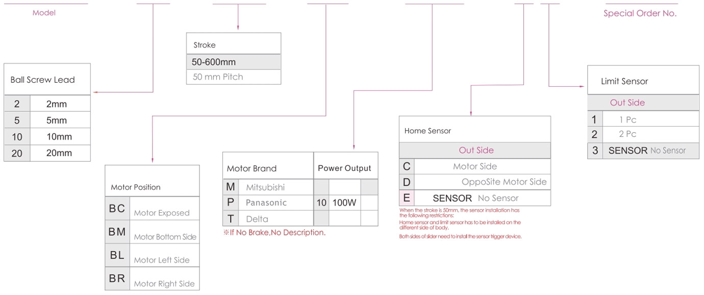 Use Where | Driven Mode | Model Specification | Moter Output(w) | Width(mm) | Repeatability(mm) | Ball Screw Spec | Maximum Payload(kg) | Maximum speed (mm/s)*1 | ||