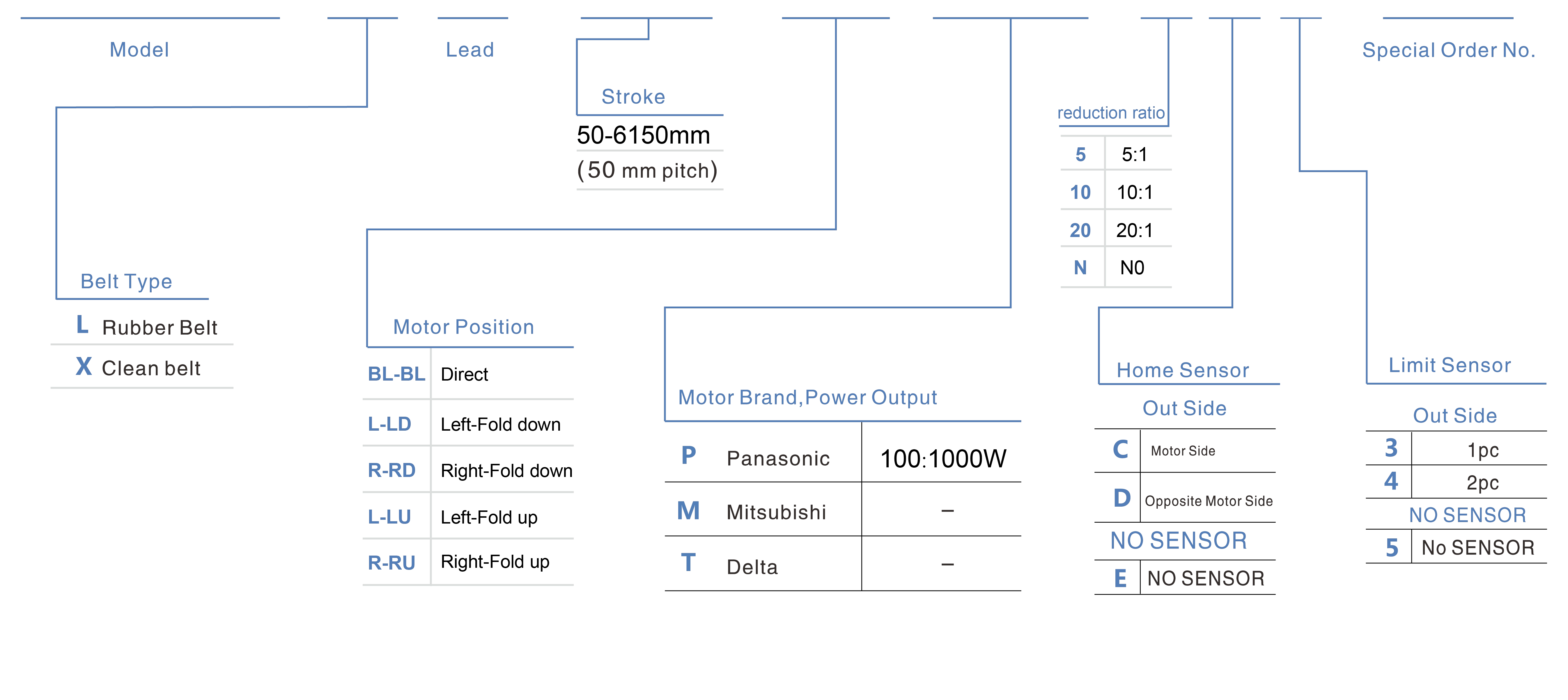 | Use Where | Driven Mode | Model Specification | Reducer Mechanism | Motor Output (w) | Width (mm) | Repeatability (mm) | Belt spec | Maximum Payload(kg) | Maximum speed (mm/s)*1 | ||