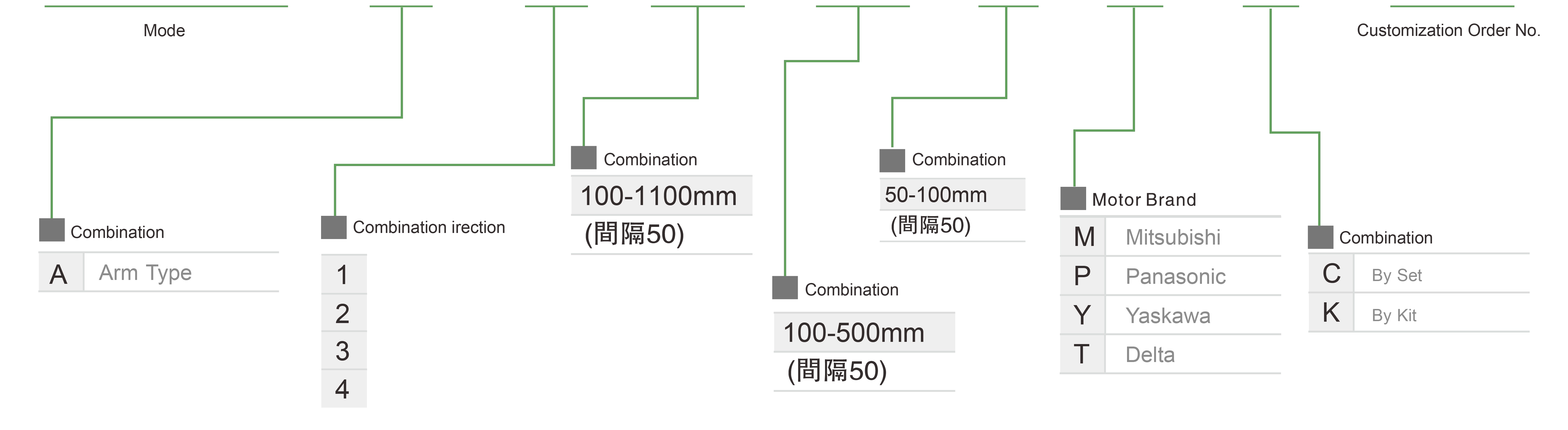 | Use Where | Driven Mode | Model Specification | Combination | Axis Numbers | Lead | Maximum speed(mm/s) | Stroke(mm) | ||||||