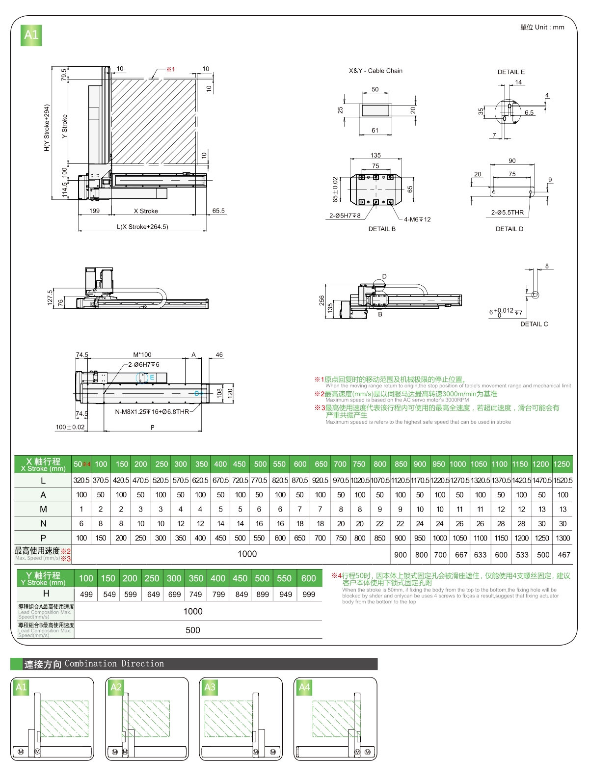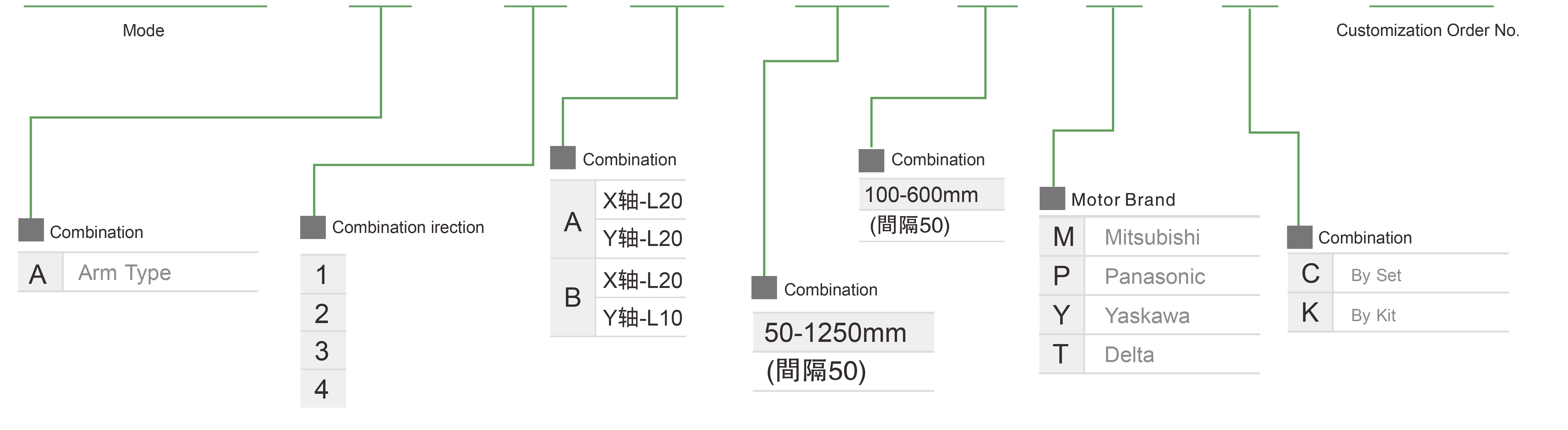 | Use Where | Driven Mode | Model Specification | Combination | Axis Numbers | Lead | Maximum speed(mm/s) | Stroke(mm) | ||||||