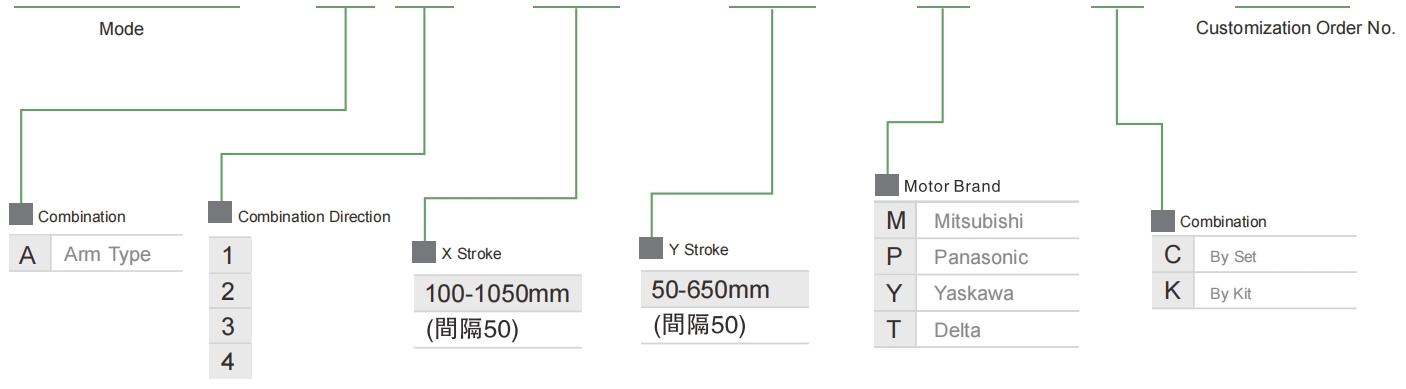 Use Where | Driven Mode | Specification | Combination | Axis Numbers | Maximum speed(mm/s) | Stroke(mm) | ||||